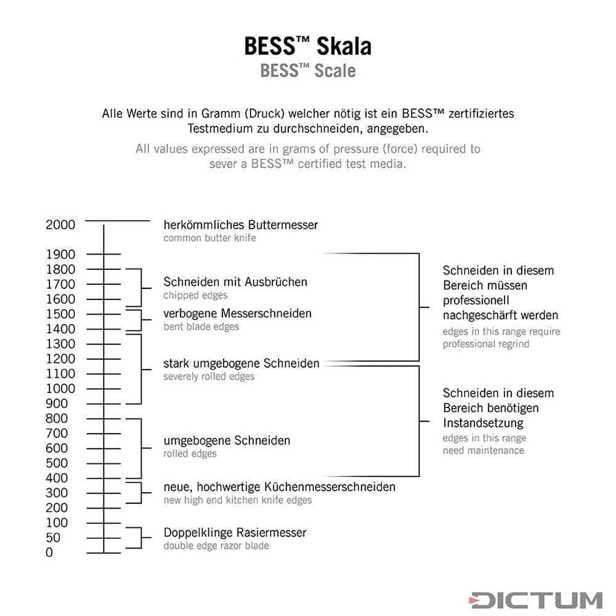 Der ermittelte BESS-Wert ist das maximale Gewicht in Gramm, das zum Durchtrennen des Testdrahts benötigt wurde. Eine scharfe Schneide braucht weniger Druck, um den Draht zu durchtrennen, als eine stumpfe. Je höher also der BESS-Wert ist, umso stumpfer ist die Klinge bzw. je niedriger er ist, umso schärfer ist sie. Da es sich um numerische Werte handelt, können die Werte miteinander verglichen werden. Beispielsweise benötigt ein frisch geschärftes, doppelseitig geschliffenes Rasiermesser nur ca. 50 BESS zum Zerteilen des Drahts. Die Schärfe eines frisch geschärften Küchenmessers liegt zwischen ca. 220 bis 380 BESS. Ab einem Wert von 400 BESS sollten die meisten Messer und Werkzeuge nachgeschärft werden, es sei denn, es handelt sich um ein Buttermesser, das einen BESS-Wert von 2000 haben darf.